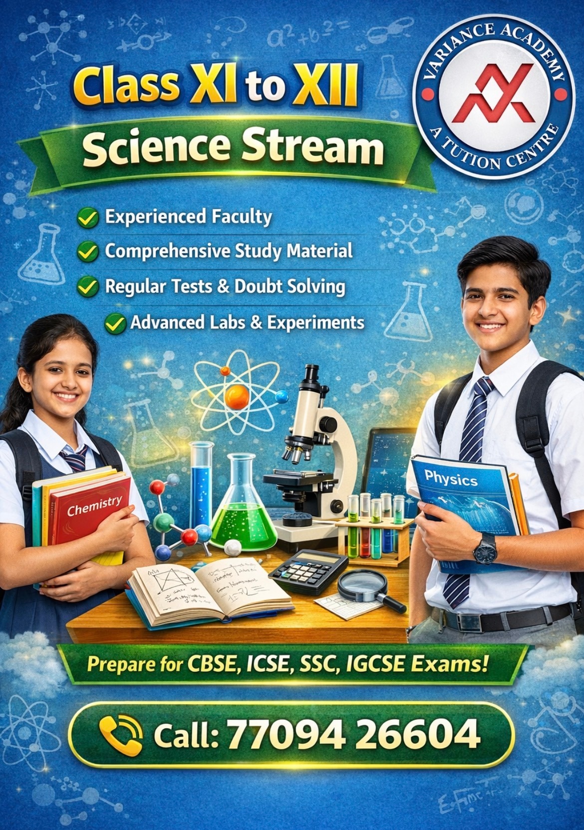 For higher secondary students, Variance Academy provides structured coaching to help students excel in board exams and competitive entrance tests. Subjects Covered Mathematics Physics Chemistry Features In-depth conceptual teaching Application-based problem solving Regular tests and performance analysis Personalized attention through small batches